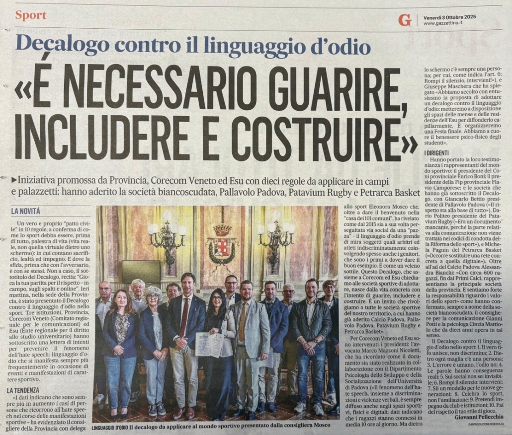 Nella giornata di ieri, presso la Sala Consiliare di Palazzo Santo Stefano, sede storica della Provincia di Padova e della Prefettura; Corecom (Comitato regionale per le comunicazioni) del Veneto, Esu (Ente regionale per il diritto allo studio universitario) e Provincia di Padova, hanno sottoscritto una lettera d’intenti per prevenire il fenomeno dell’hate speech, promuovendo uno specifico decalogo contro il linguaggio d’odio che si manifesta sempre più frequentemente in occasione di eventi e manifestazioni di carattere sportivo.